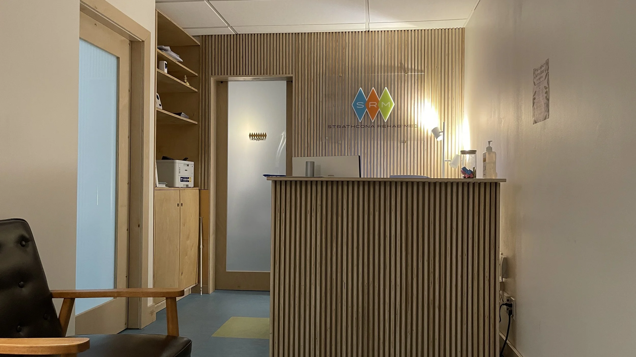Cozy mid-century styled reception area with wooden slat design, a frosted door, shelves with office supplies, and a logo on the wall reading 'Strathcona Rehab' with colorful diamond shapes