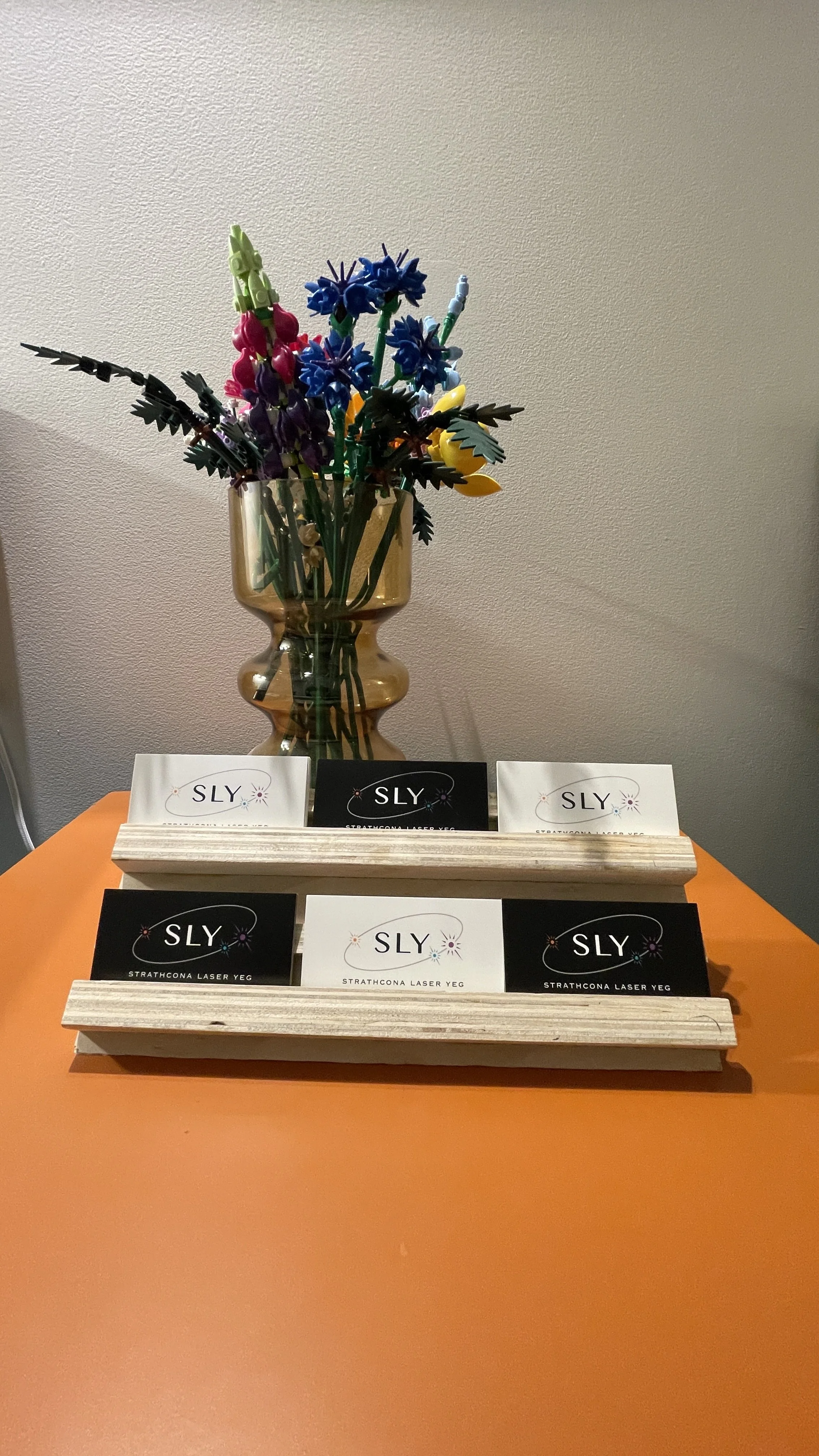 A table with a vase of colorful plastic flowers and a display of business cards for SLY, a laser clinic, on an mid-century modern orange table.