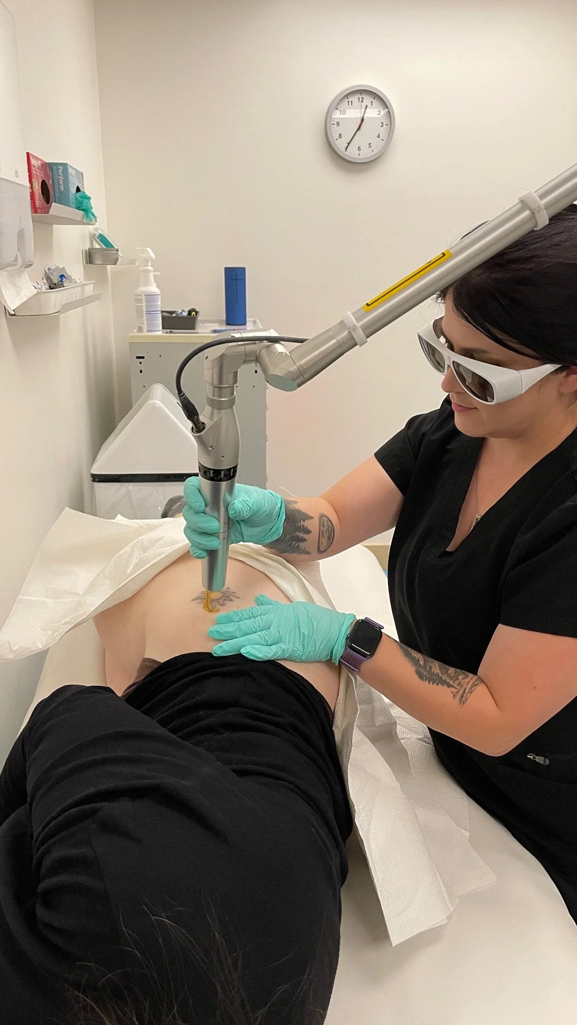 A person receiving a tattoo on their side using a Candela PicoWay laser tattoo remover, with the laser technician wearing glasses, gloves, and a watch in a medical-like setting.